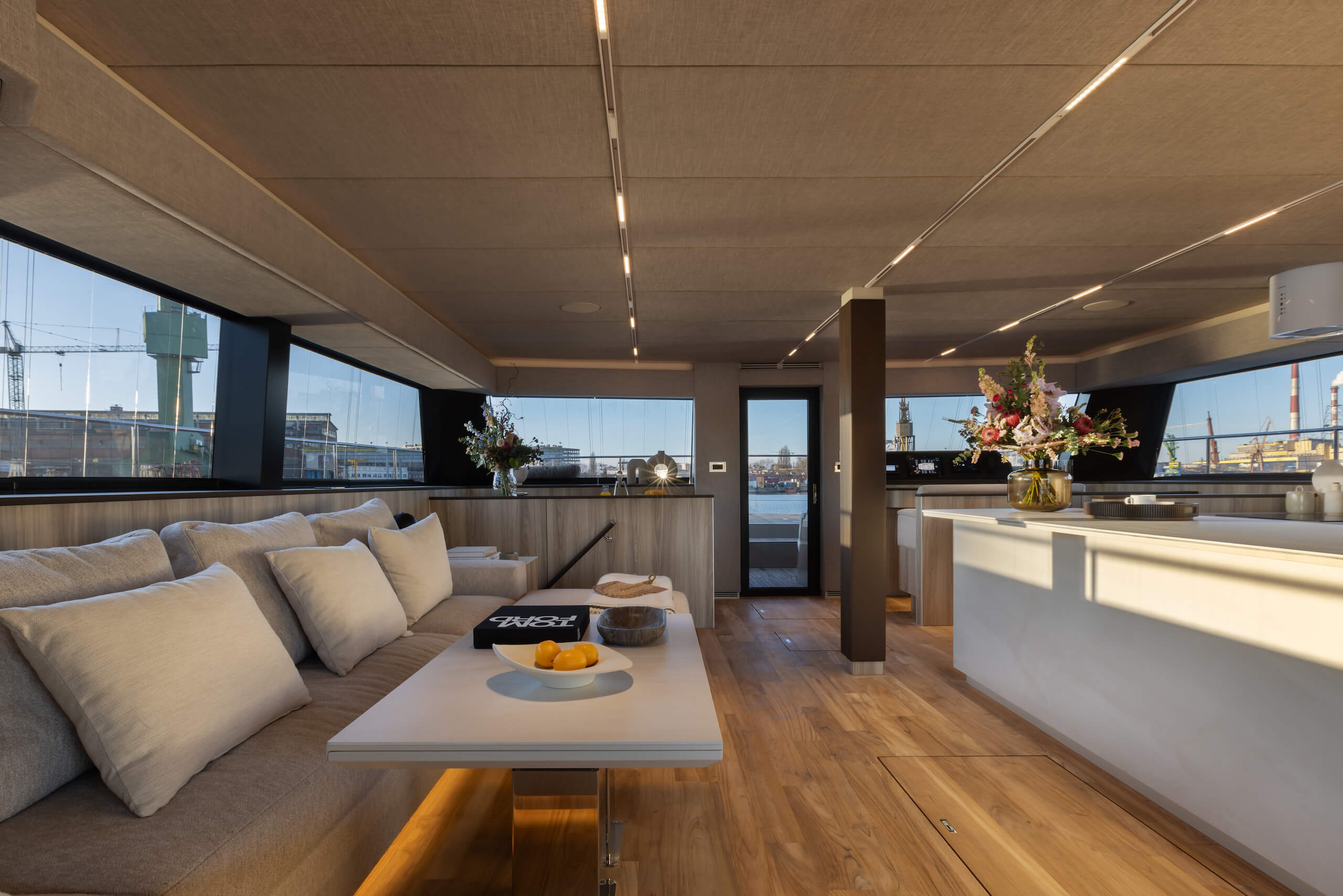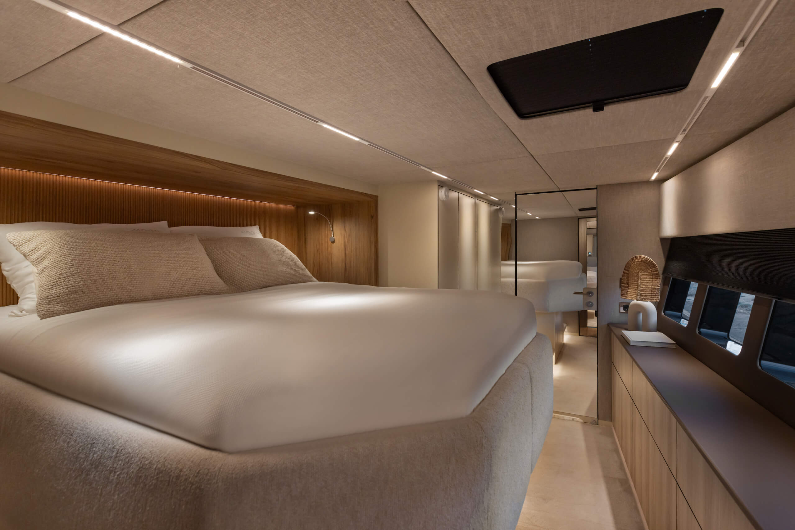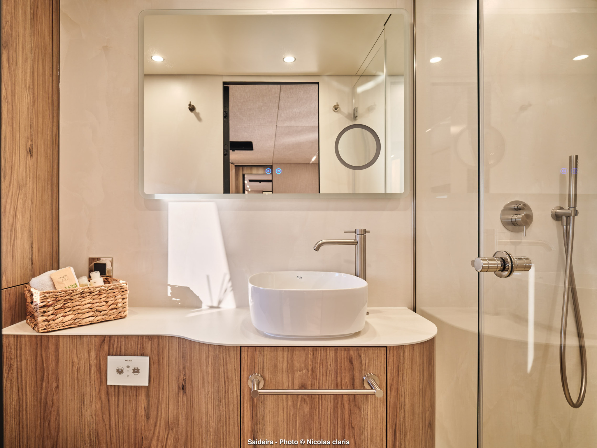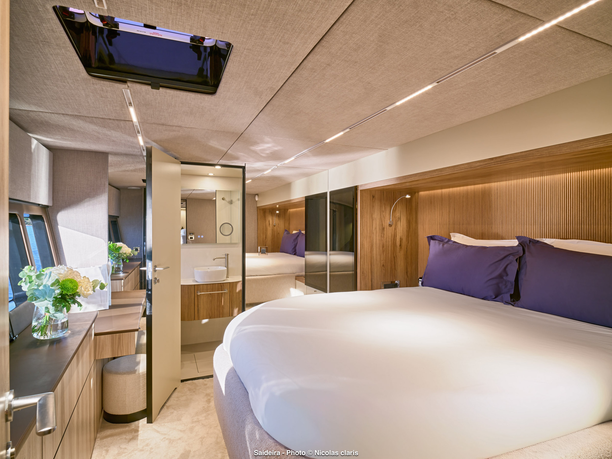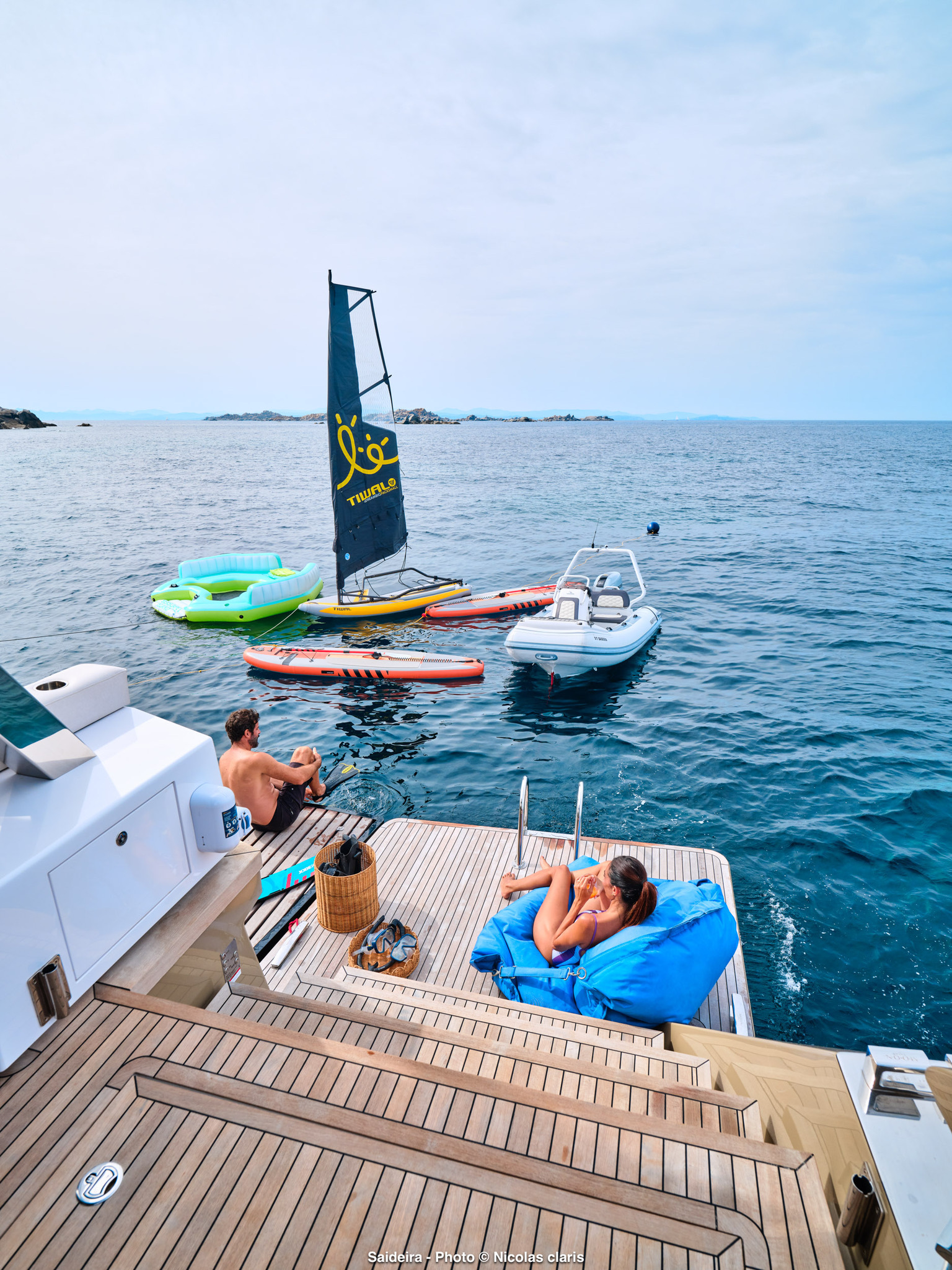 Guests can enjoy a range of water activities, including waterskiing, wakeboarding, paddleboarding, and snorkeling, with equipment such as a tender with 60hp engine, sailing dinghy, and e-foil. For off-water fitness, a stationary bike and gym kit are provided. And Saideira has plenty of yoga mats to perfect your practice!